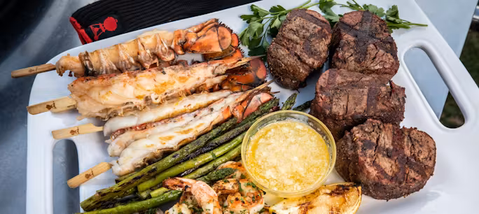 The classic surf and turf combination is lobster tail and filet mignon, but steak and prawns, shrimp, or scallops will do just as well. Next to testing your skills, surf and turf serves up a sizzling smorgasbord that satisfies a variety of tastes around the table. Barbecuing surf and turf can be a challenge, but with a few simple tips in mind, you’ll achieve mouth-watering perfection.